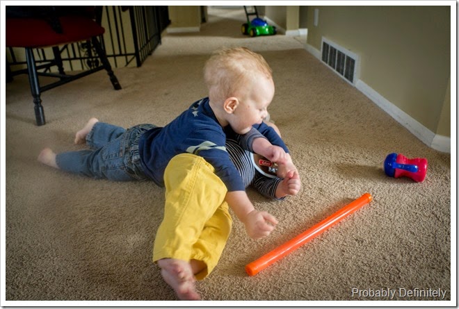 Crawling is nothing more than a way of getting him to an object he can pull up on. This boy just wants to stand. I’m just waiting for him to start cruising the furniture, I’m pretty sure we are getting close to that milestone. This boy just might be walking by his first birthday!